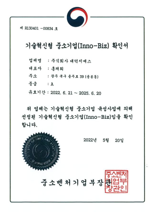 기술혁신형 중소기업(Inno-Biz) 인증서